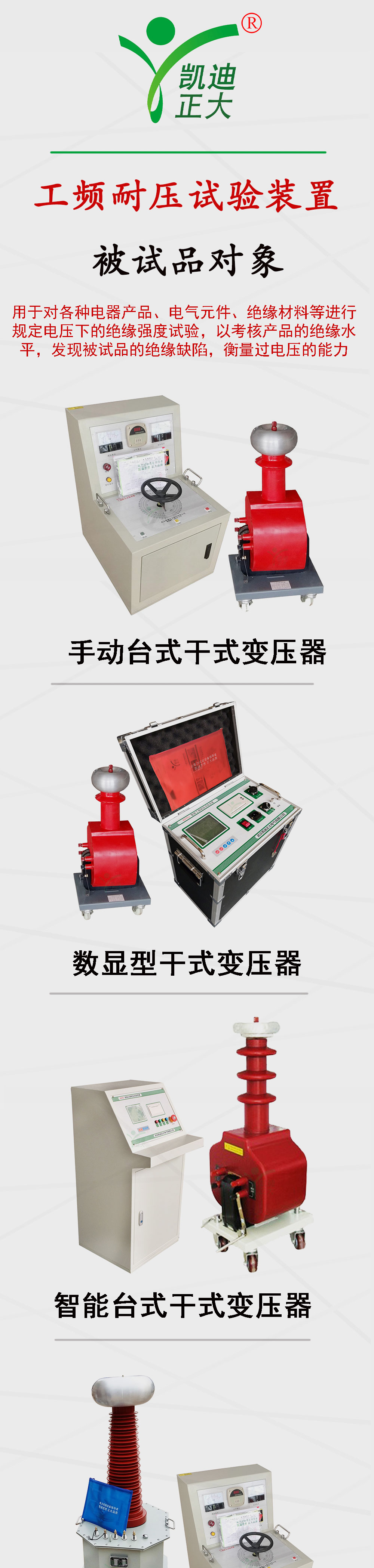 2.   KDGTB工頻耐壓試驗裝置是根據國家新的電力行業標準而設計的、性能新的的耐壓試驗設備,用于對各種電器產品、電氣元件、絕緣材料等進行規定電壓下的絕緣強度試驗,以考核產品的絕緣水平,發現被試品的絕緣缺陷,衡量過電壓的能力。