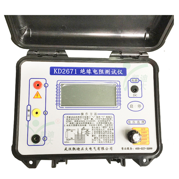 KD2671系列型智能數字絕緣電阻測試儀采用嵌入式工業單片機實時操作系統,智能數字與數字段碼顯示較好結合,該系列表具有多種電壓輸出等級(250V、500V、1000V、2500V、5000V、10000V)、容量大、抗干擾強、模擬指針與數字同步顯示、交直流兩用、操作簡單、自動計算各種絕緣指標(吸收比、極化指數)、各種測量結果具有防掉電功能等特點。是測量大容量變壓器、互感器、發電機、高壓電動機、電力電容、電力電纜、避雷器等絕緣電阻的測試儀器。