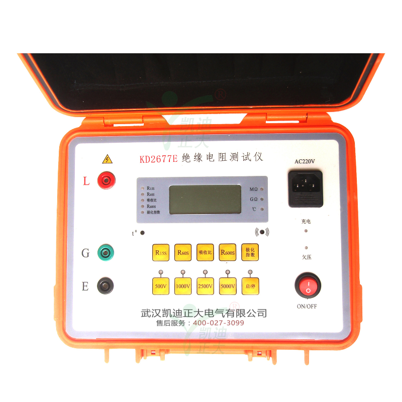 KD2677E高壓絕緣搖表是根據絕緣電阻測量的基本要求,采用較新電子電路設計而成的,其基本原理是采用電壓、電流法測量被測物的電阻值:R=V/I。機內的存儲、運算電路使本機可自動測量吸收比(R1min/R15s)和極化指數(R10min/R1min)。