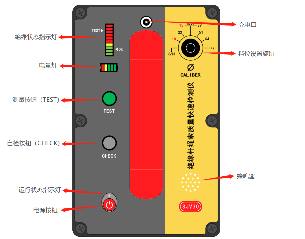 電源按鈕”、“運行指示燈”、“測試按鈕(TEST”、“自檢按鈕(CHECK”、“檔位設置旋鈕”、“充電口”、“絕緣狀態指示燈”、“電池電量指示燈”。