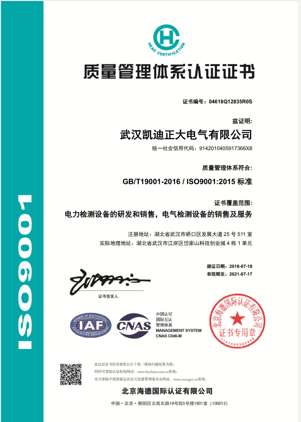 武漢凱迪正大最新版ISO9001:2015標(biāo)準(zhǔn)質(zhì)量管理認(rèn)證證書