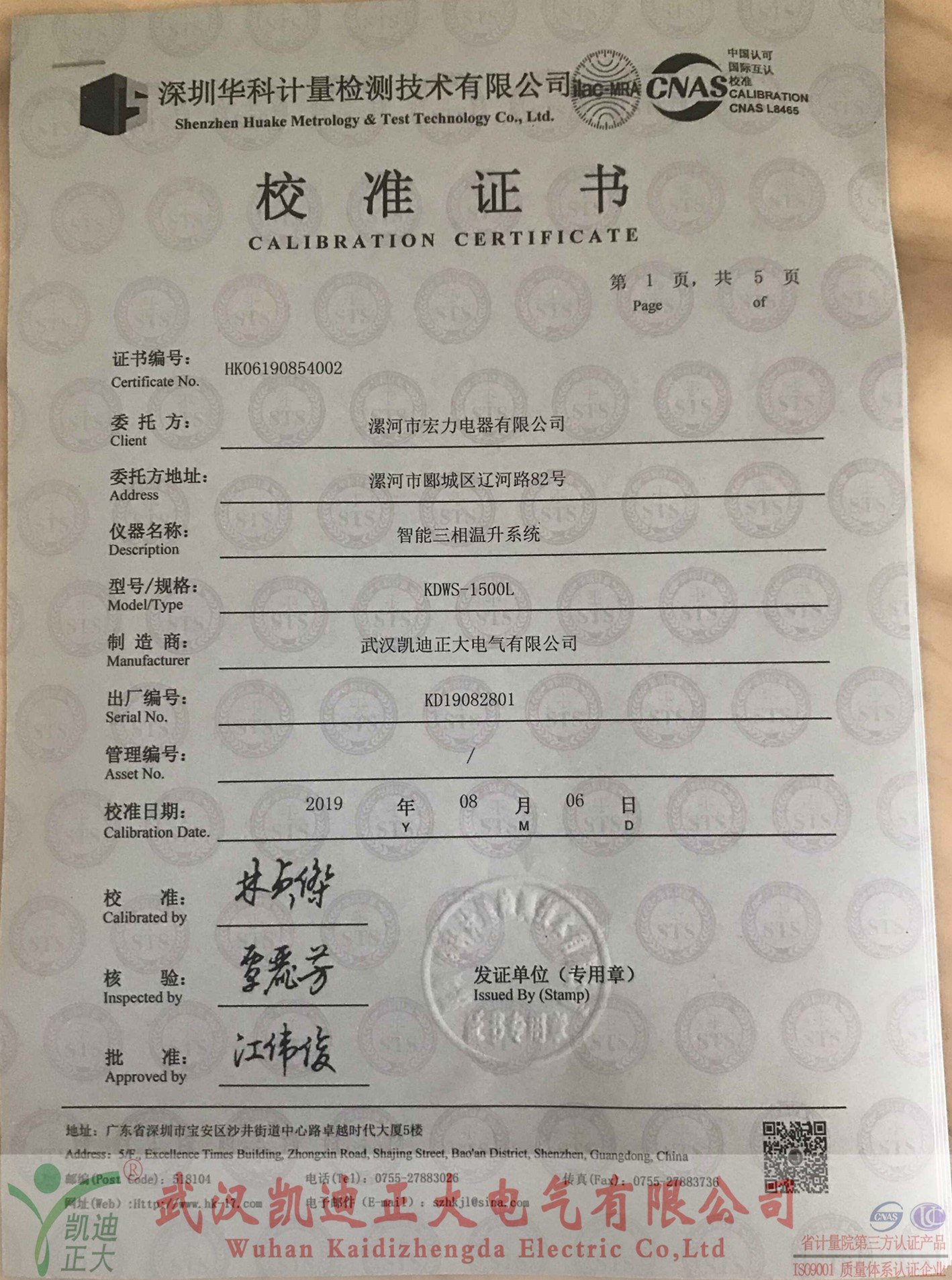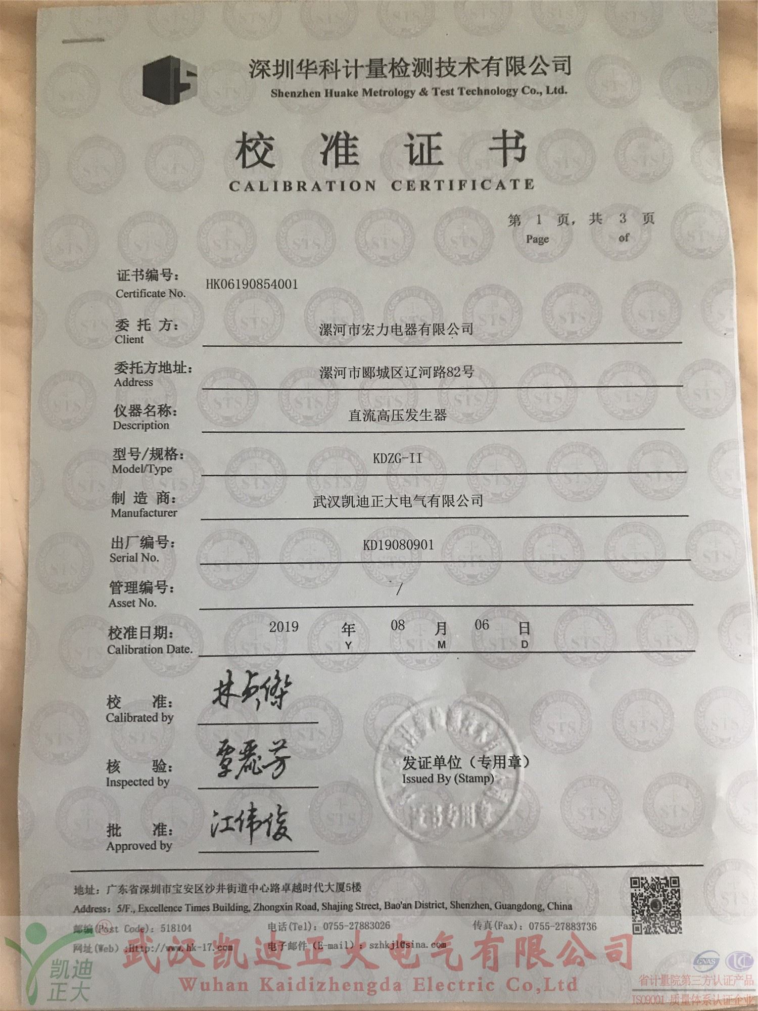 漯河宏力電器采購我司設(shè)備獲得深圳華科計(jì)量證書