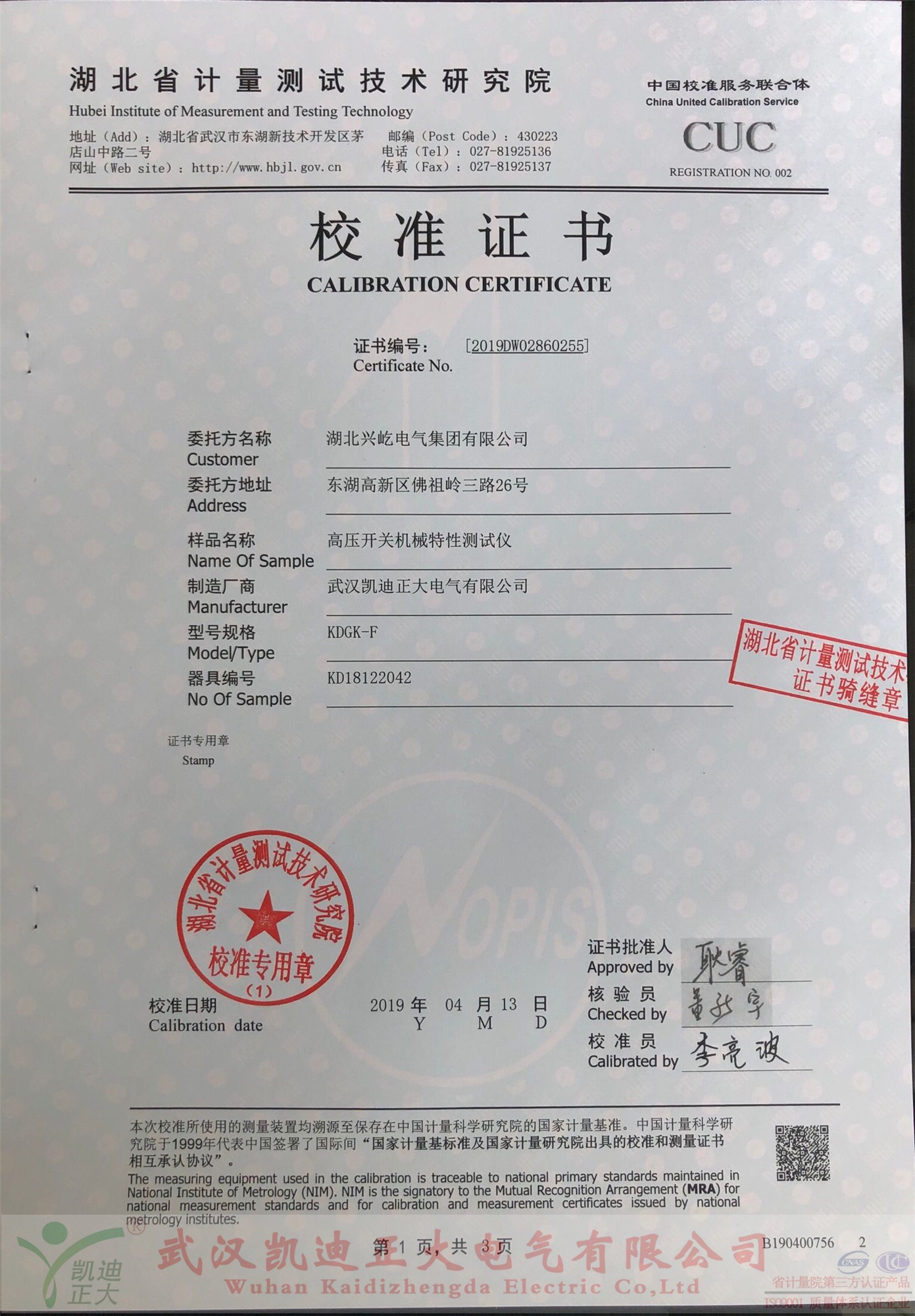 購買后便送往中國校準服務聯合體-湖北省計量測試技術研究院檢定,由省計量院出具的《校準證書》,證書編號:2019DW2860255,校準員:李亮波,檢驗員:董新宇,證書批準人:耿睿。