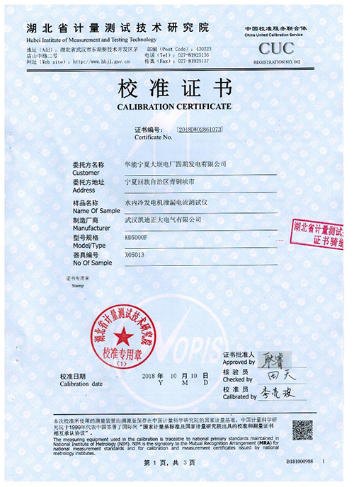 武漢凱迪正大KD5000F水內冷發電機泄漏電流測試儀校準證書