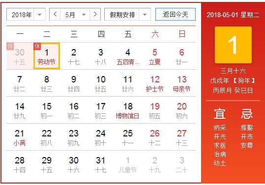2018年五一放假安排時間表最新國務院官方發布: 4月29日(星期天)至5月1日(勞動節,星期二)放假調休,共3天。 友情提示:4月28日(星期六)上班。