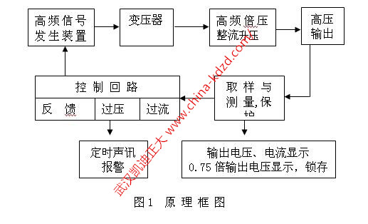 KDZG系列便攜式直流高壓發(fā)生器采用倍壓電路,率先應(yīng)用最新的PWM脈寬調(diào)制技術(shù),閉環(huán)調(diào)整,采用了電壓大反饋,使電壓穩(wěn)定度大幅度提高。該發(fā)生器具有紋波系數(shù)小、輸出穩(wěn)定可靠,體積小、重量輕的特點,且具有可靠、靈敏的內(nèi)部保護功能,其原理框圖如圖1所示。