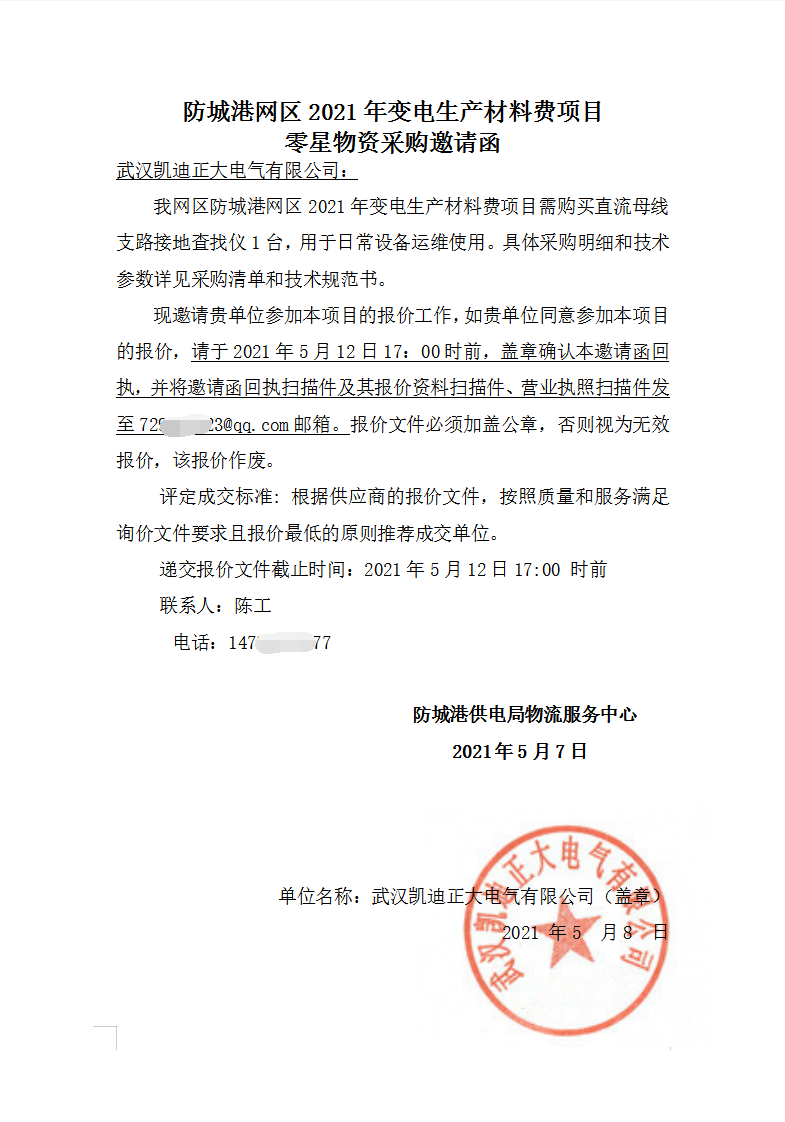 防城港網(wǎng)區(qū)2021年變電生產(chǎn)材料費(fèi)項目零星物資采購邀請函