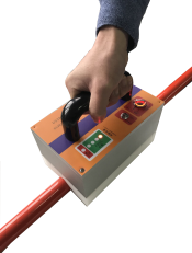 (4)將檢測儀v形電極對準桿、棒、繩索并滑動使其全部通過檢測,觀察led顯示屏狀態:一旦紅色的燈亮起,表示被測物體不合格,將檢測儀轉向再做幾次測試。若被測試品直徑超過39mm,將桿或管旋轉90度再做幾次測試。