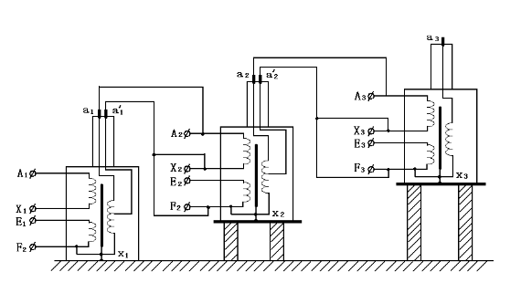 為了得到更高電壓的試驗變壓器,也可采用串級的方法獲得更高的電壓。圖二為三級串試驗變壓器的原理接線圖。其中三臺變壓器的容量和電壓關系滿足:P1=2P2=3P3,U(總)=U1+U2+U3S,