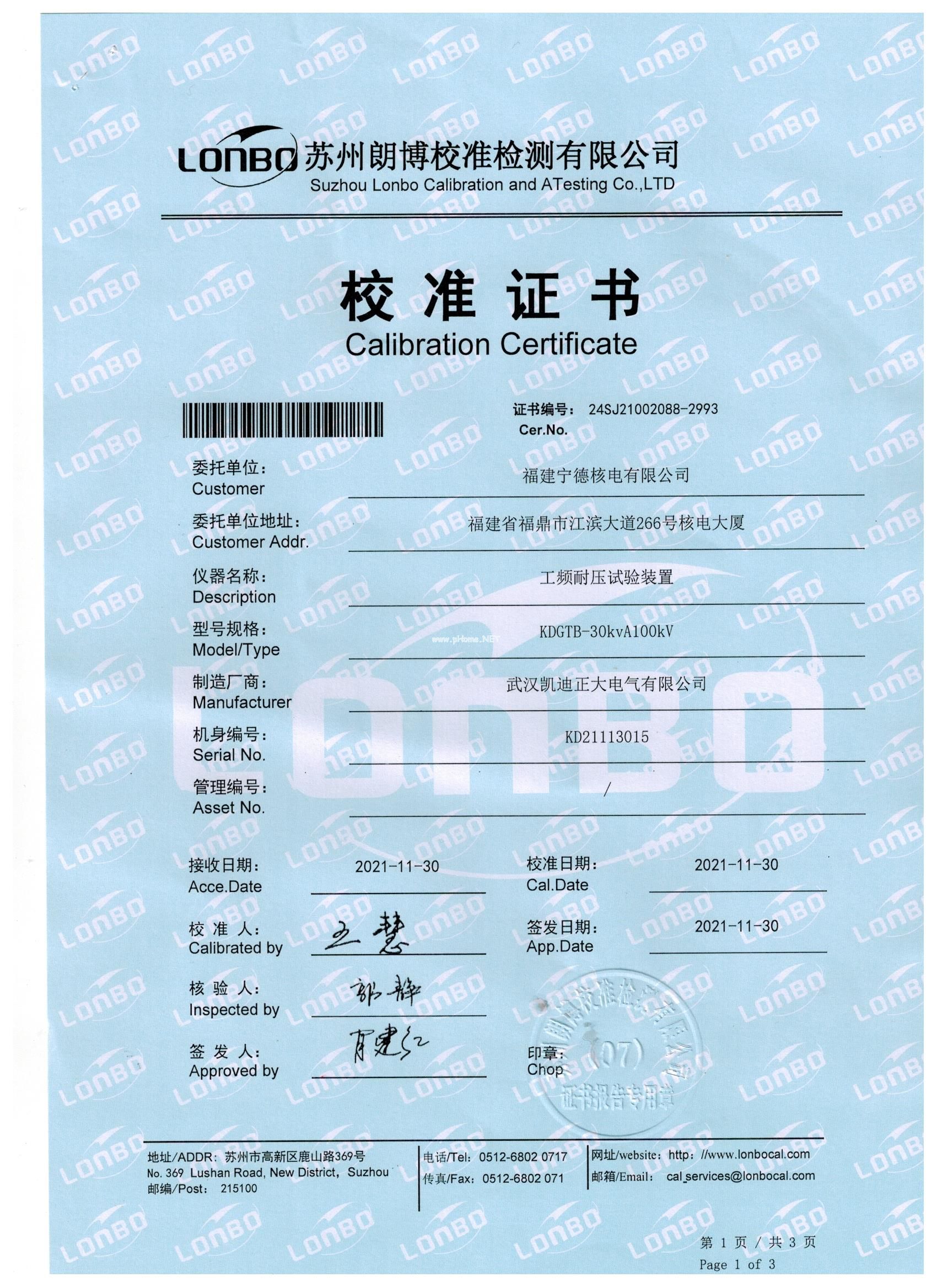 依據《中華人民共和國合同法》,本著平等互利的原則,經福建寧德核電公司和武漢凱迪正大電氣雙方友好協商,共同達成如下協議:福建寧德核電公司采購凱迪正大KDGTB-30KVA100KV工頻耐壓試驗裝置,并由甲方委托蘇州朗博校準檢測有限公司出具檢測報告。