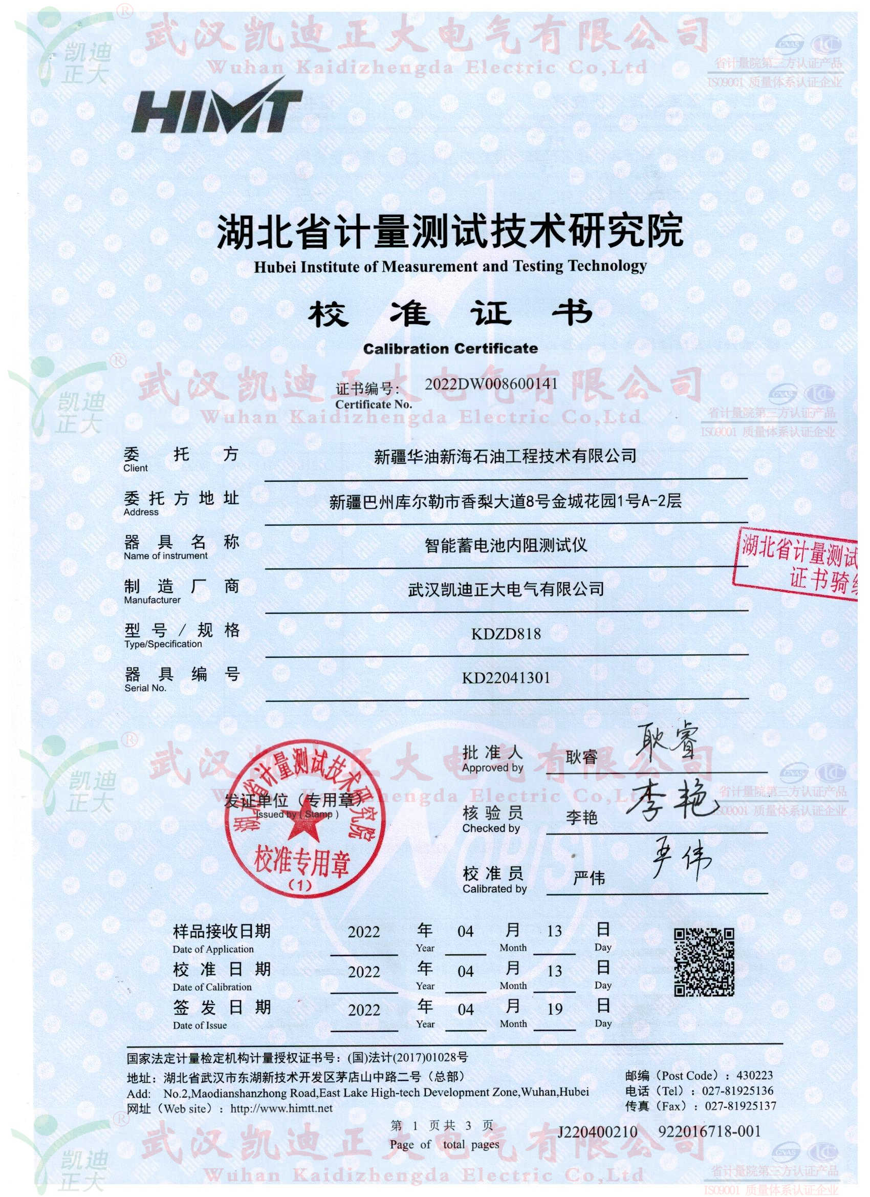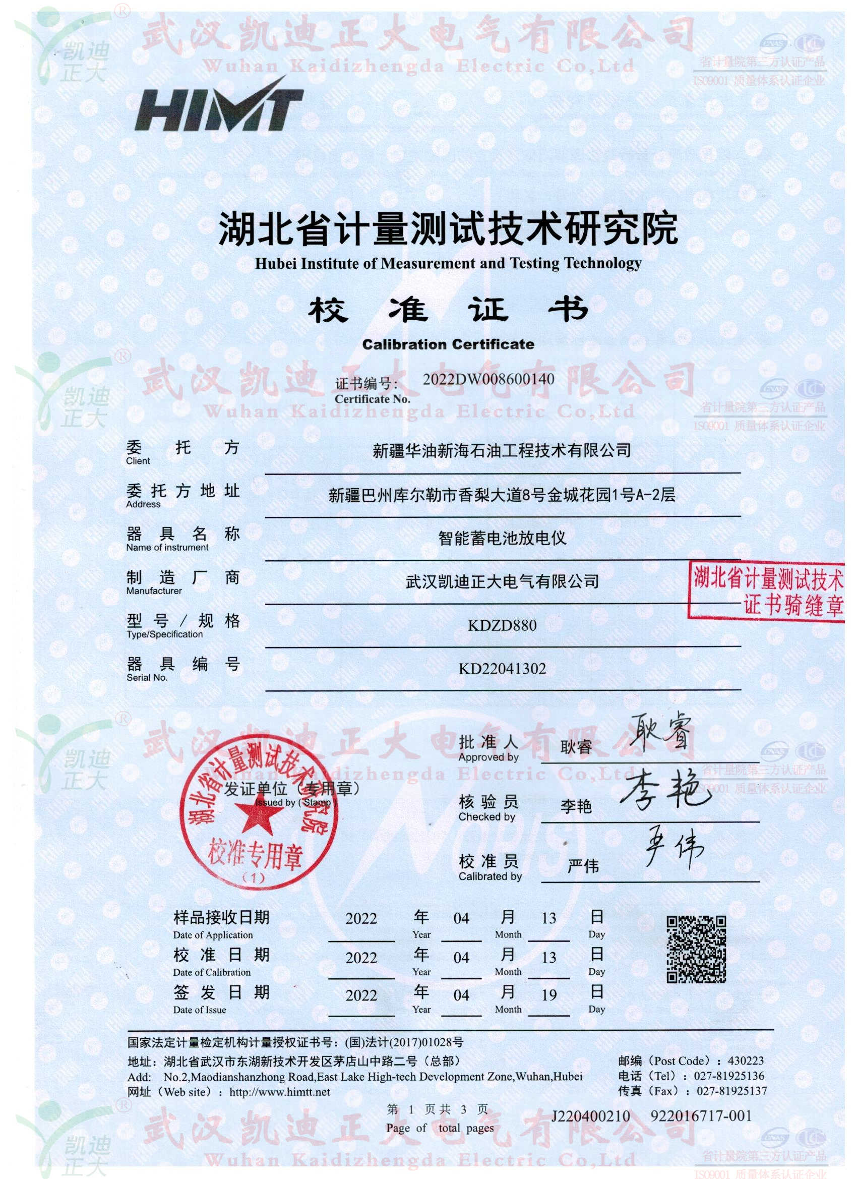 今年3月份,新疆華油工程部劉工致電我司。吐槽之前買的一批揚(yáng)州某公司設(shè)備,使用不是很理想。這次選擇我們的KDZD818智能蓄電池內(nèi)阻測(cè)試儀、KDZD882智能蓄電池放電監(jiān)測(cè)儀等設(shè)備。話說(shuō)“一朝被蛇咬十年怕井繩”,這次購(gòu)買設(shè)備還是對(duì)比武漢幾家企業(yè)后綜合售后服務(wù)、品牌力、設(shè)備性能對(duì)比選擇我司,簽署技術(shù)協(xié)議并要求獲得湖北省計(jì)量測(cè)試技術(shù)研究院檢定報(bào)告,對(duì)于這些常規(guī)要求,我司幾乎有實(shí)力、有信心能夠獲得計(jì)量證書。