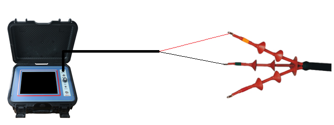 先將雙夾測試線接至(預(yù)定位儀后側(cè)板)采樣端口,再將測試線的紅夾子夾在電纜的一個好相,黑夾子夾在電纜的另一個好相。