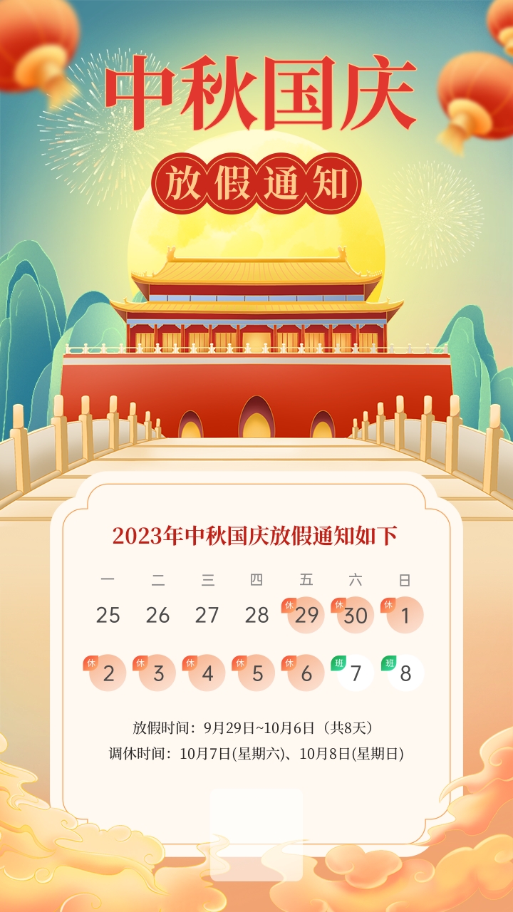 9月29日至10月6日放假調(diào)休,共8天,10月7日(星期六)、8日(星期日)上班。