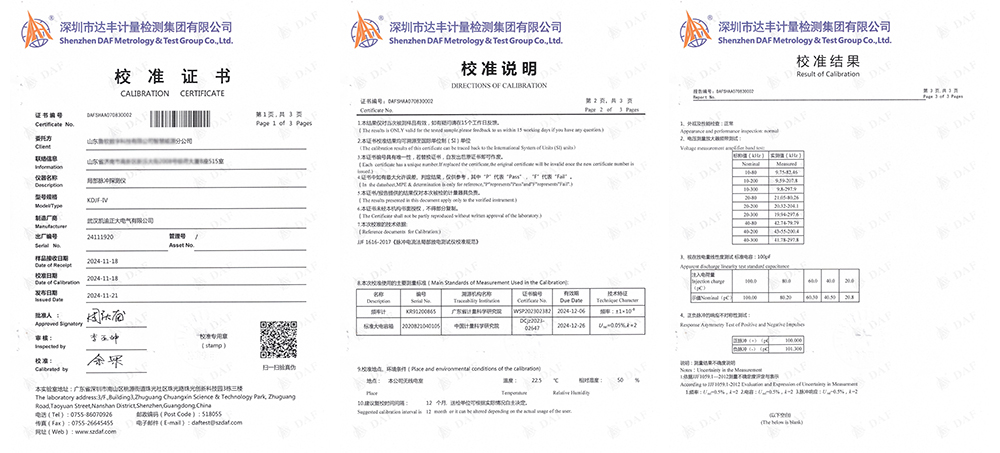近日,山東某能源分公司采購凱迪正大電氣生產(chǎn)的KDJF-IV局部脈沖探測儀順利通過了深圳市達豐計量檢測集團有限公司的校準。