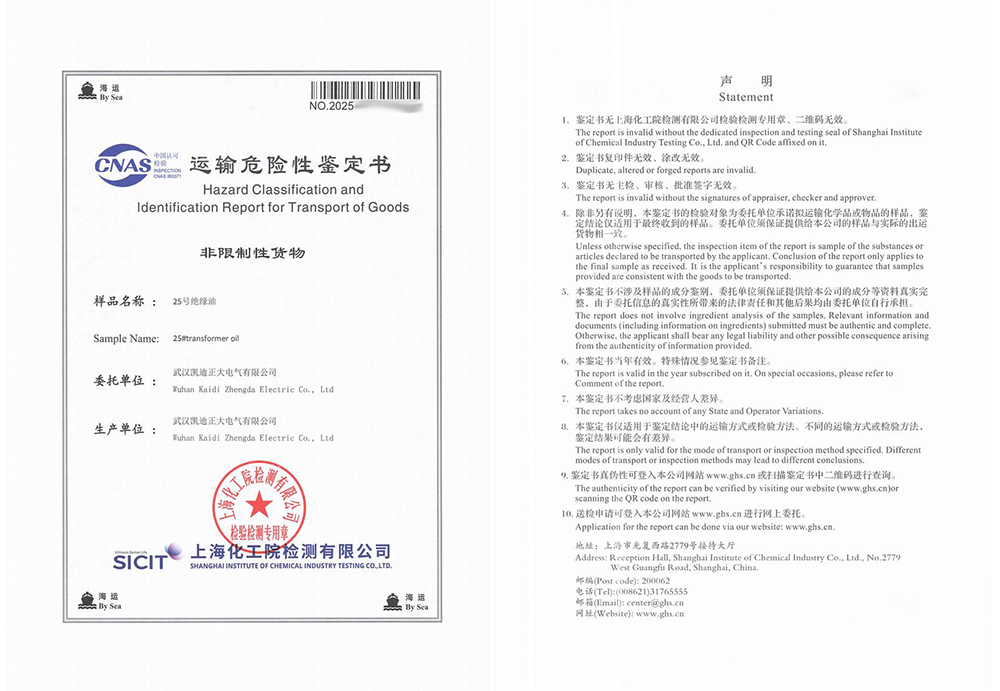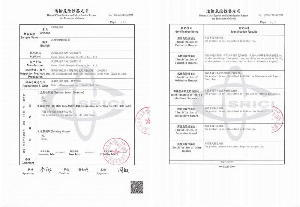 在國(guó)際海運(yùn)中,危險(xiǎn)品的運(yùn)輸管理有著嚴(yán)格的標(biāo)準(zhǔn)與規(guī)范,油式試驗(yàn)變壓器所用的絕緣油作為液體類物質(zhì),是否屬于易燃易爆危險(xiǎn)品,需通過(guò)專業(yè)的運(yùn)輸危險(xiǎn)性鑒定予以確認(rèn)。為此,武漢凱迪正大委托上海化工院檢測(cè)有限公司對(duì)KD2675設(shè)備中使用的25號(hào)絕緣油進(jìn)行了全面檢測(cè)。