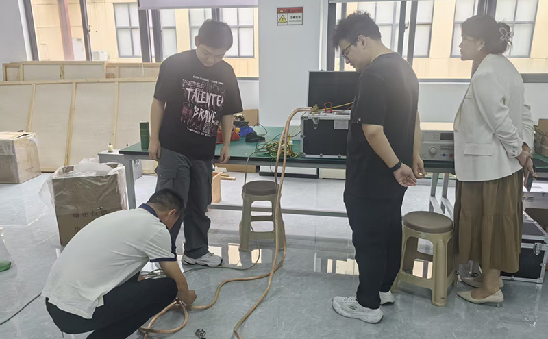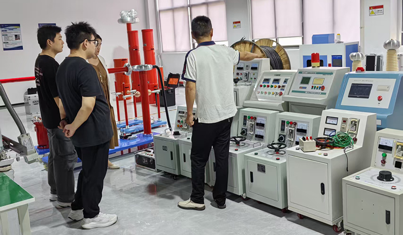隨后,技術人員陪同嘉賓走進生產車間。我們向來賓簡要說明了高壓諧振電抗器、超高壓耐壓測試儀等產品的組裝與調試。希望通過呈現有序的生產現場和嚴謹的作業流程,讓代表團感受到凱迪對產品品質的切實追求與保障能力。
