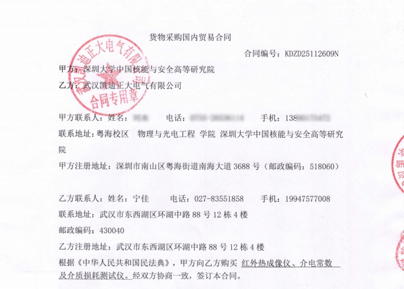 近日,深圳大學(xué)中國(guó)核能與安全高等研究院正式采購(gòu)了武漢凱迪正大電氣有限公司的KDRX-2581紅外熱成像儀與KDYD-JZ介電常數(shù)及介質(zhì)損耗測(cè)試儀,合同編號(hào)KDZD25112609N。
